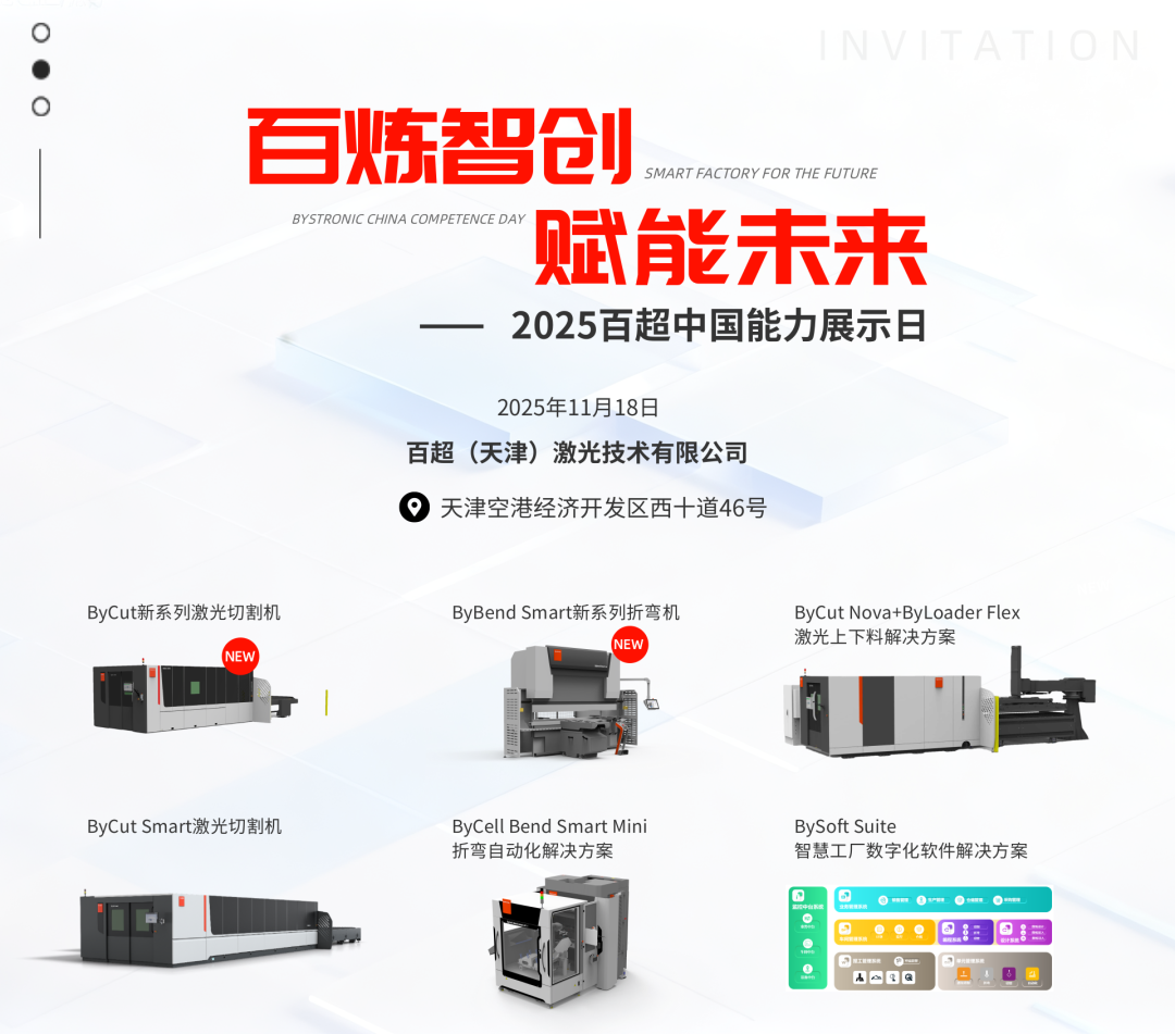 在数字化浪潮与智能制造深度融合的新时代,创新已成为驱动产业升级的核心引擎。作为全球金属加工领域的指引者,百超始终坚守创新初心,以出色技术持续推动制造业的革新与跃升。为全面展示百超在智能制造领域的前沿成果与综合实力,我们将于2025 年11月18日隆重举办主题为 “百炼智创 赋能未来” 的能力展示日活动。